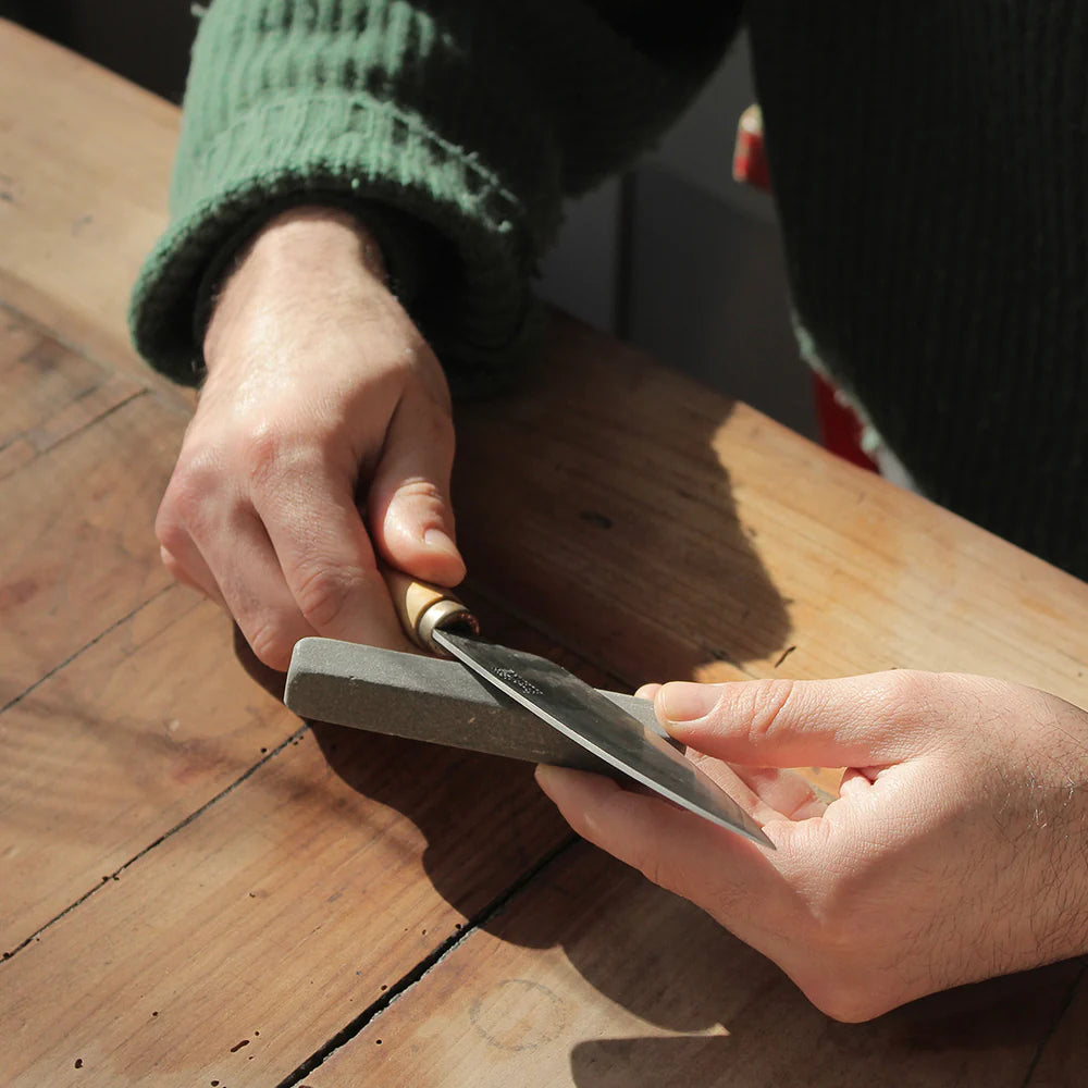 - Préparez la pierre : Si votre pierre est une pierre à eau, immergez-la dans l'eau pendant environ 10 à 15 minutes jusqu'à ce que plus aucune bulle ne se forme. Les pierres à huile nécessitent un léger enduit d'huile d'aiguisage avant utilisation.