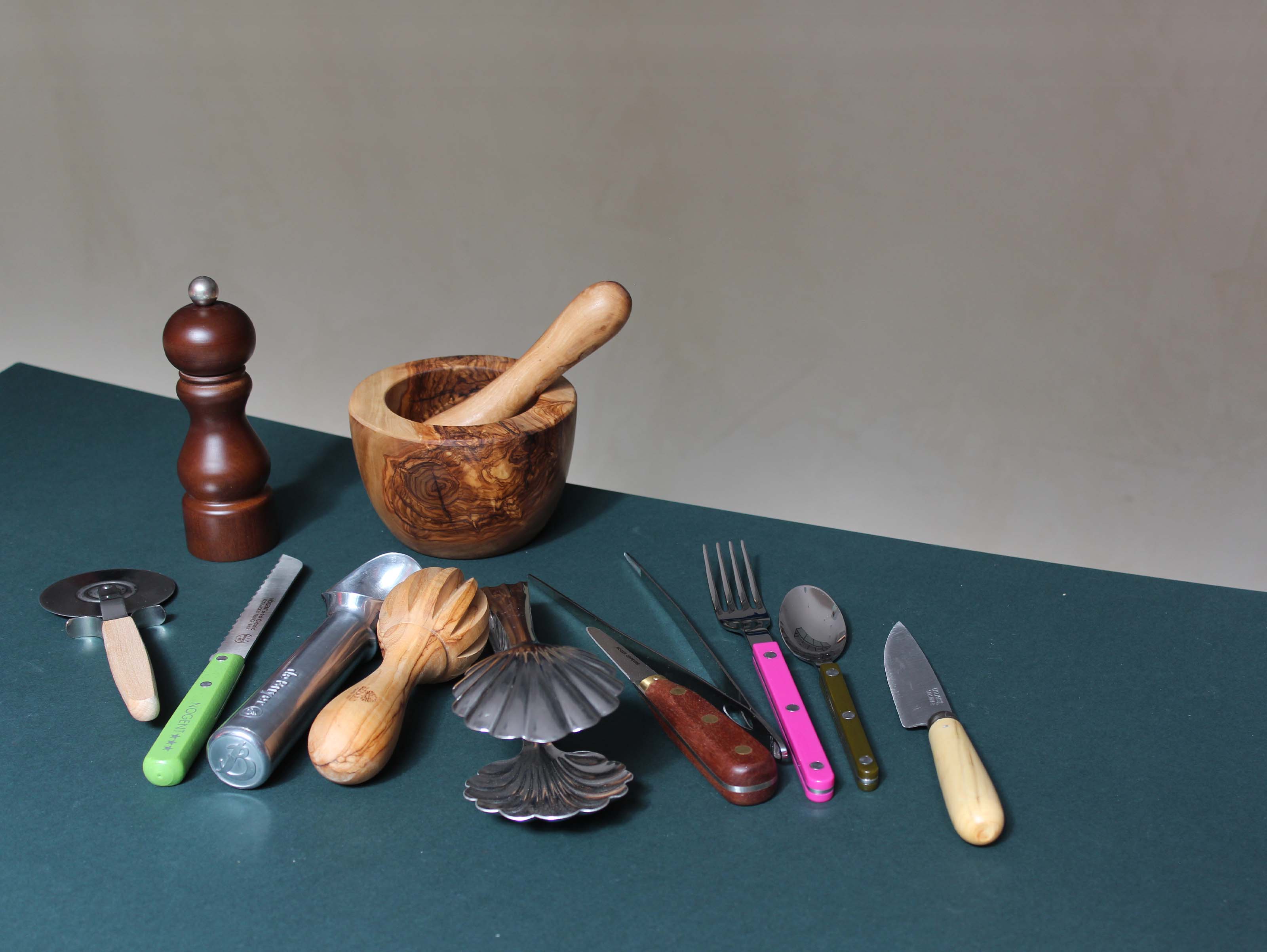 Une sélection pointue d'ustensiles professionnels de cuisine et de pièces de caractère pour la table.